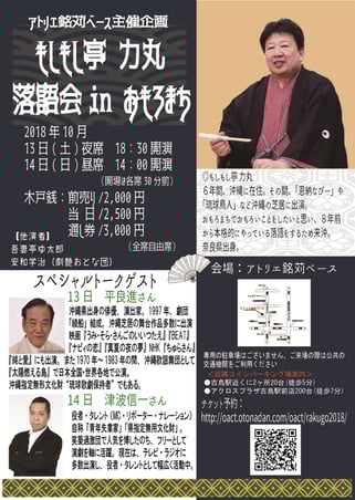 元沖縄在住の落語家・もしもし亭力丸さんによる落語会。落語の寄席&スペシャルトークゲストとのオモロイトークショーをお楽しみください。